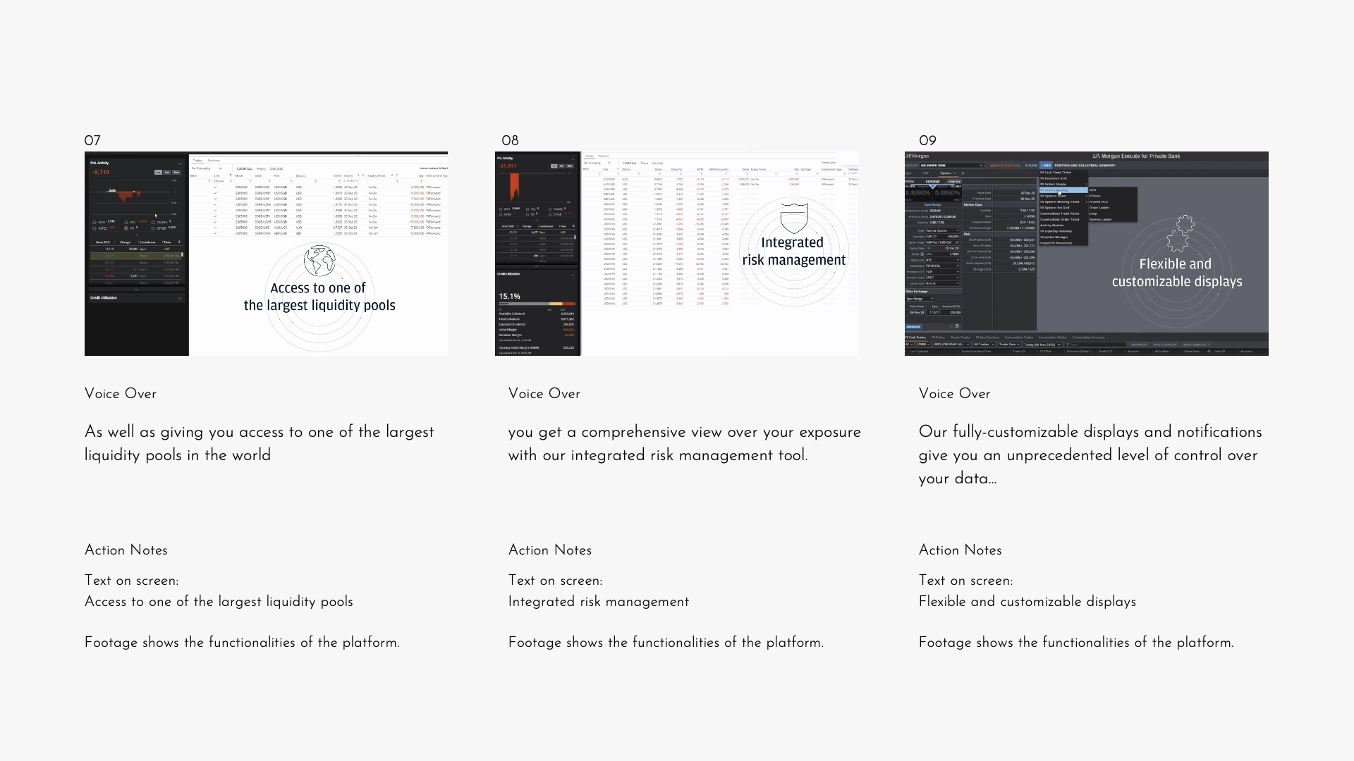To start the project a mood board and style frames were created. The key was to find a right balance between J.P. Morgan Private Bank brand images and the tech visuals of the platform.